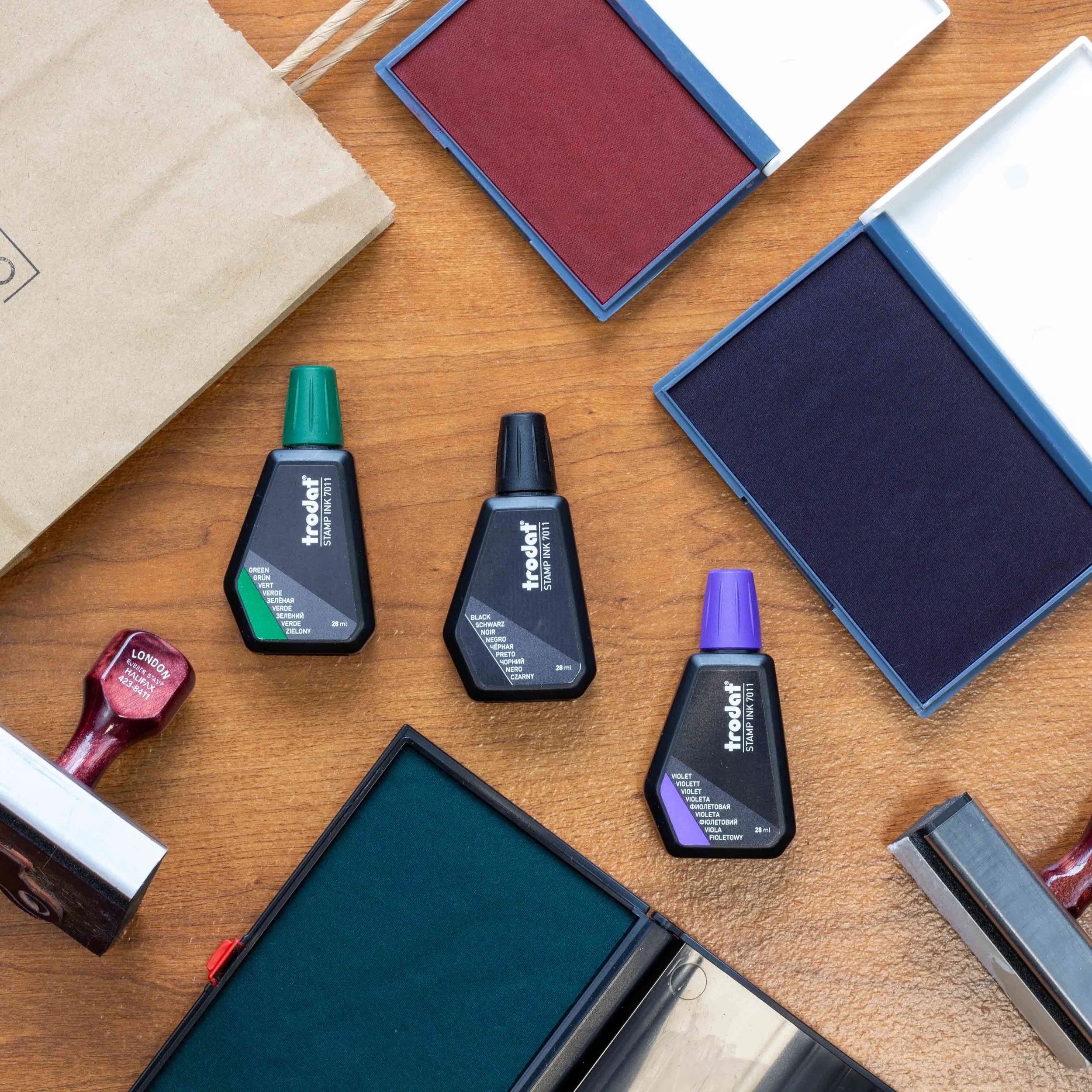 We carry standard stamp pads in black, blue, red, green, violet and dry. Or replace your stamp pad ink with refill ink bottles. Call or email us for other colours.